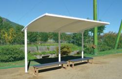 ●柱/鉄製、電気亜鉛メッキ処理後焼付塗装、φ101.6、φ76.3mm(屋根)●屋根材/シート張●ベースプレート式●W4108.5×D2474×H2516mm●240kg●組立式