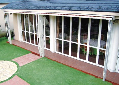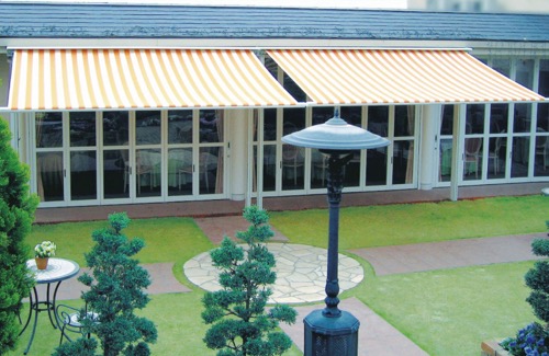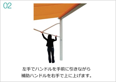 ●サイズ/W4904×D2631(収納時348)×H2797mm●フレーム/アルミ製●キャンバス/アクリル生地●設置方法:柱埋め込み式●工事費別途●カラー:フレーム白、キャンバス色は数種類の中からお選びいただけますのでお問い合わせください。